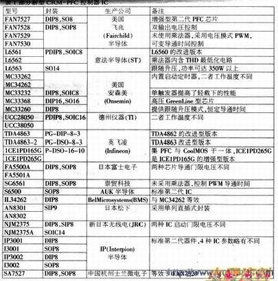 CCM-PFC电路适用于中大功率开关电源和变频调速器及高亮度放电(IliD)灯电子驱动器。在500W以上的开关电源应用中,PFC/PWM组合IC(如UCC38500系列、CM6900系列和MIA800系列等)因适用功率范围较小。是难以取代CCM-PFC独立单片IC的。表2列出了部分新型CCM-PFC控制IC.