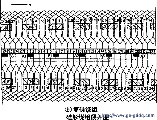 硅绕组是由接在同一换向器并联运行的叠绕组和波绕组组合而成的一种混合绕组,因其外形如硅而得名。单叠绕组和复波绕组组成的混合绕组叫单硅绕组,双叠绕组和复波绕组组成的混合绕组叫复硅绕组,其绕组的展开图如图所示。