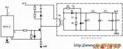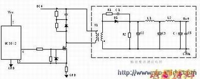 T1为开关变压器,其初极和次极的相位相反。D1为整流二极管,R1、C1为削尖峰电路。L1为续流电感,R2为假,C4、L2、C5组成π型滤波器。