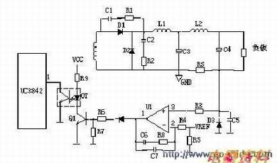 当输出 U0升高,经取样电阻R7、R8、R10、VR1分压后,U1③脚电压升高,当其超过U1②脚基准电压后 U1①脚输出高,使Q1导通,光耦OT1发光,光电三极管导通,UC3842①脚电位相应变低,从而改变U1⑥脚输出占空比减小,U0降低。 当输出 U0降低时,U1③脚电压降低,当其低过U1②脚基准电压后U1①脚输出低电平,Q1不导通,光耦OT1发光二极管不发光,光电三极管不导通,UC3842①脚电位升高,从而改变U1⑥脚输出占空比增大,U0降低。周而复始,从而使输出电压保持稳定。调节VR1可改变输出电压值。