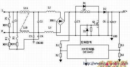 输入电压经L1、L2、L3等组成的EMI滤波器,BRG1整流一路送PFC电感,另一路经R1、R2分压后送入PFC控制器作为输入电压的取样,用以调整控制信号的占空比,即改变Q1的导通和关断时间,稳定PFC输出电压。L4是PFC电感,它在Q1导通时储存能量,在Q1关断时施放能量。D1是启动二极管。D2是PFC整流二极管,C6、C7滤波。PFC电压一路送后级电路,另一路经R3、R4分压后送入PFC控制器作为PFC输出电压的取样,用以调整控制信号的占空比,稳定PFC输出电压。