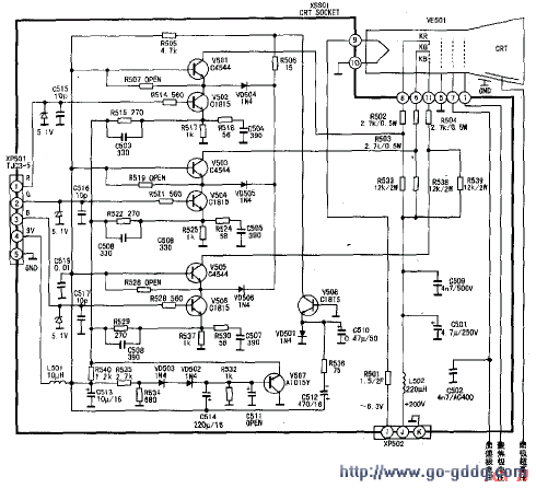由于C514连接在电源+9V与V507基极之间,也可避免电源瞬变而引起亮度的瞬变。