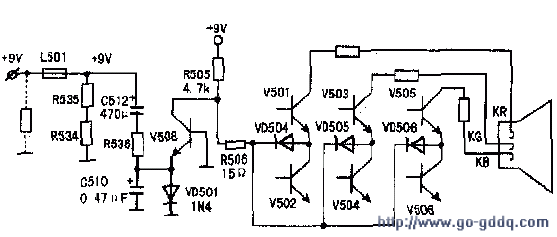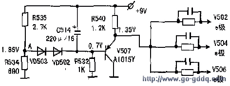由V507, VD502,VD503, R534, R535, C514, R540组成的有源即为V502, V504, V506的射极静态偏置电压跟随电路。R535,R534组成分压网络,分压点电压1.85V经VD503串VD502降压至V507基极,约为0.7V,其射极电压约为1.35V左右,作为共射放大器V502, V504, V506三只放大管的射极偏置电压源。共基极放大器的基极偏置电压直接由+9V电源提供,共基极放大管的基极经C513交流接地,因此就输入、输出信号而言V501、V503,V505为共基电路。采用V507(型管)作为视放共射放大器的射极静态偏里电压跟随器,是因为视放共基极放大管V501, V503, V505的基极都接在+9V电源端点上。电源电压稍有变化,就会影响其静态工作点,使输出管静态集电极电位变动而影响荧屏的亮度。为此,采用图3的电路,使共射放大器射极偏置电压跟随+9V电源微量的变动而同步变动,即+9V电源略有变化时,V502, V504,V506发射极电压跟随变化,确保共射、共基两只晶体管不随电源微量变动而变动,也就是说V501, V503, V505的集电极静态电位不变。这一方面可保证大批量产品性能的一致性,也可确保单机亮度不受电源电压微量变化的影响。VD503, VD502结电压(0.5-0.7V)随温度上升而减小,使V507射极电位上升,可补偿视放共射、共基级联放大器两只申联晶体管随温度上升而增加,造成静态工作点变化的影晌,使视放末级大器的温漂减小、工作稳定性大大提高。