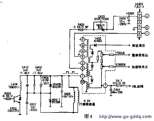 视放电路工作所需的约200V直流电压,由逆程输出的行逆程脉冲经VD416整流、C428滤波再叠加在B+(130V)电压上提供(参见图4所示),并经由XP402的1脚接CRT板(J)端(黄线引入),进入CRT板后由L502、C501、C509去藕滤波加到共基放大器集电极负载电阻的一端,R533、R538、R539(均为12kΩ/2W电阻)分别为V501、V503、V505的集电极负载电阻。由逆程变压器灯丝电压绕组提供的为6.3V交流电压,由接插件XP402的4脚接CRT板(I)端(红线引入),在CRT板上灯丝电压的提供需串联R501(1.5Ω/2F),但在1.5Ω下方不用2W而用2F,表明R501(为2瓦易熔阻燃保护膜电阻)加到显像管的灯丝。如果在维修中更换、调整逆程电容、更换显像管等,需用有效值电压表检测灯丝电压,使其在6.3Vrms(有效值)士5%范围内,可变更R501的阻值来达到。显像管工作所需加速极电压、聚焦极电压、阳极高压等均由行逆程变压器提供,直接加到显像管相关各极。