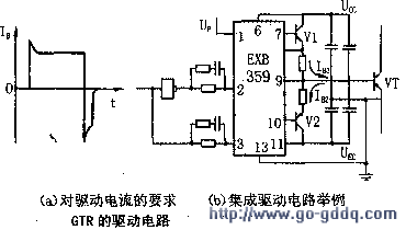 目前,GTR的驱动大多采用集成驱动,如图(b)所示。图中,晶体管V1和V2构成外接的互补驱动电路,V1用于向GTR(VT)提供正向驱动电流,V2则提供反向偏置。