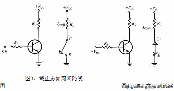 图一所示是NPN三极管的 共射极,图二所示是它的特性曲线图,图中它有3 种工作区域:截止区(Cutoff Region)、线性区 (Active Region) 、饱和区(Saturation Region)。三极管是以B 极IB 作为输入,操控整个三极管的工作状态。若三极管是在截止区,IB 趋近于0 (VBE 亦趋近于0),C 极与E 极间约呈断路状态, = 0,VCE = V。若三极管是在线性区,B-E 接面为顺向偏压,B-C 接面为逆向偏压,IB 的值适中 (VBE = 0.7 V), I C =h F E I B 呈比例放大,Vce = Vcc -Rc I c = V cc - Rc hFE IB可被 IB 操控。若三极管在饱和区,IB 很大,VBE = 0.8 V,VCE = 0.2 V,VBC = 0.6 V,B-C 与B-E 两接面均为正向偏压,C-E间等同于一个带有0.2 V 电位落差的通路,可得I c=( Vcc - 0.2 )/ Rc ,Ic 与 IB 无关了,因此时的IB大过线性放大区的IB 值, Ic<hFE IB 是必然的。三极管在截止态时 C-E 间如同断路,在饱和态时C-E 间如同通路 (带有0.2 V 电位降),因此可以作为开关。控制此开关的是 IB,也可以用 VBB 作为控制的输入讯号。图三、四分别显示三极管开关的通路、断路状态,及其对应的等效电路。