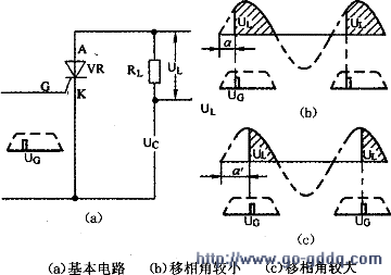 从晶闸管开始承受正向电压到出现触发脉冲之间对应的电角度α称为移相角。比较图(b)和图(c)可知:α较小时,负载上得到的平均电压UL较大;反之,如将移相角增大为α,则UL较小。