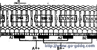 复叠绕组用得最多的是双叠绕组,它和单叠绕组的不同点是绕组的两端分别接到相距两片的换向片上,并联的支路对数等于极数。当槽数为偶数时,可连成双闭路双叠绕组,即将偶数线圈连成一个闭合回路,同样奇数线圈连成另一闭合回路,通过电刷将两回路并联起来,如图6所示。如果槽数为奇数时,则连成单闭路双叠绕组。即所有的奇数线圈连完后,接着连偶数线圈。最后只连成一个闭合回路。