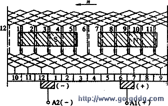 单叠绕组的连接规律是1号换向片接1号线圈的首端,与线圈首端相连的线圈边放在1号槽的上层;1号线圈的尾端接2号换向片,与线圈尾端相连的线圈边放在7号槽的下层,1号槽与7号槽相距为一个极距。接着2号换向片上还接2号线圈的首端,依此类推,最后一个线圈的尾端又接到1号换向片上,全部线圈连接完毕,刚好组成一个闭合回路。
