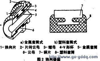 (3)换向器:由许多互相绝缘的楔形换向片装成~个圆柱体,有金属套筒式和塑料套倚式两种,如图2所示。