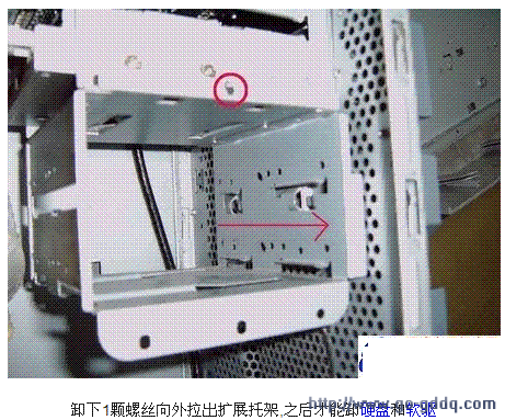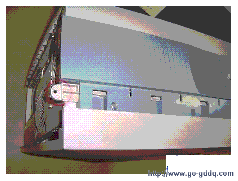 现在开拆:将半圆形锁片向里按并将侧面板向外侧抽拉,然后向后拉,现在只剩一个脚了,再旋转一下,即可打开,另一侧面板是无法打开的