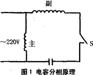 (1)电容分相启动 原理如图1所示。电极启动时,副绕组通过电容器接入电路,副绕组与主绕组在电流上产生相位差,电机启动。启动后副绕组切除,主绕组独立运行。为了提高绕组的利用率二有时将开关取消,副绕组接入电路运行。