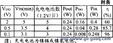 若选择vDo分别为2v、0。5v、0。1v(输出电流100mA、Vout=3。0V)的稳压器,则所需电池数不同、效率也不一样,数值如附表所示。表中:PDO为由压差造成的损耗功率,PDo=Iout×VDO;为稳压器输入功率,Pin=PDo+Pout,Pout为输出功率,Pout=Iout×Vout;η为转换效率,η=Pout/(Pout+PDO),(最高效率)。
