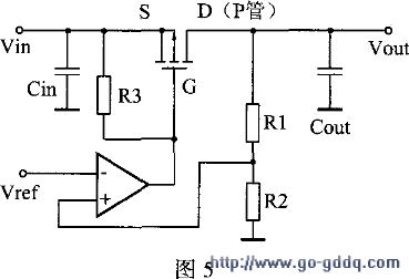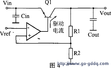 图4是一种低压差结构,采用一只PNP管作调整管,其压差进一步减小到0。3~0。6v,其最小值为该PNP管的饱和管压降,即VDO(min),=vcE(SET)。由于大功率PNP管的饱和管压降难做到0。3v以下,这种结构最小压差的极限为0。3V左右。