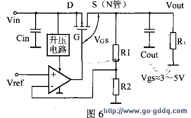 采用P沟道MOSFET作调整管在结构上是最简单的,如图5所示。但P沟道MOSFET需占较大的硅片面积;另外,其导通也较N沟道大些,因此,最好是采用N沟道功率MOSFET作调整管,如图6所示。为了保证一定的VGS,以保证足够大的ID及足够小的RDs(on),要保证VGS≈3~5V,即VG=Vout+(3-5v)。为满足这一要求,芯片上加入3个升压电路,提高VG电压。这种升压电路采用升压式电荷泵电路为多,由于它的负载电流很小,其泵可做在芯片上。