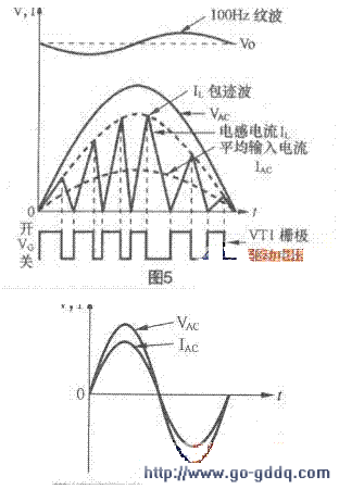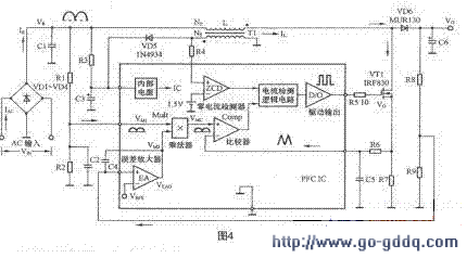 这种PFC升压变换器的工作原理如下:当接通AC线路后,由于电容C1容值仅为0.1~0.22?F,只用作高频旁路,故桥式整流输出为100的正弦半波脉动电压(VR),亦即AC半正矢,通过R3的电流对电容C3充电,当C3上的电压升至IC的启动门限(大多为11V左右)以上时,接通IC电源电压(Vcc),IC开始工作,并驱动PFC开关VT1动作,一旦PFC升压变换器进入正常运行状态,升压电感器T1的次级绕组则感生高频脉冲信号,经二极管VD5整流和电容C3滤波,为IC提供工作电压和电流,桥式整流后AC输入电压经R1和R2组成的分压器分压,作为乘法器的一个输入(CM1)。升压变换器的DC输出电压,在电阻分压器下部电阻R9上的分压信号,反馈到IC误差放大器的输入端,并与误差放大器同相输入端上的参考电压VREF比较,产生一个DC误差电压VEAO,也输入到乘法器。乘法器的输出VMO是两个输入(VM1和VM2)的结果,作为IC电流感测比较器的参考。当IC驱动VT1导通时,升压二极管VD6截止,流过L的电流从0沿斜坡线性增加,并全部通过VT1和地回复。一旦IL在开关周期内达到峰值,VT1上的驱动脉冲变为零电平,VT1截止,电感器L中的储能使VD6导通,通过L的电流IL沿向下的斜坡下降。一旦IL降为零,L的次级绕组产生一个突变电势被IC的零电流检测器接收,IC产生一个新的输出脉冲驱动VT1再次导通,开始下一个开关周期。IC的电流检测逻辑电路同时受零电流检测器和电流传感比较器的控制,可确保在同一时刻IC只输出一种状态的驱动信号。VT1源极串联电阻R7用作感测流过VT1的电流。只要R7上的感测电压超过电流传感比较器的触发门限电平,PFC开关VT1则截止。当AC线路电压从零按正弦规律变化时,乘法器输出VMO为比较器建立的门限强迫通过L的峰值电流跟踪AC电压的轨迹。在各各开关周期内电感峰值电流形成的包迹波,正比于AC输入电压的瞬时变化,呈正弦波波形。在两个开关周期之间,有一个电流为零的点,但没有死区时间,从而使AC电流通过桥式整流二极管连续流动(二极管的导通角几乎等于180?),整流平均电流即为AC输入电流(为电感峰值电流的1/2),呈正弦波波形,且与AC线路电压趋于同相位,因而线路功率因数几乎为1(通常为0.98~0.995),电流斜波含量符合IEC1000-3-2标准的规定要求。与此同时,由于PFC电压控制环路的作用,PFC变换器输出经提升的稳压DC电压,纹波很大,为100HZ,同样为正弦波。其控制原理与开关电源一样,其DC输出电压在90~270V的AC输入电压范围内保持不变。