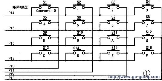 矩阵键盘又称为行列式键盘,它是用4条I/O线作为行线,4条I/O线作为列线组成的键盘。在行线和列线的每一个交叉点上,设置一个按键。这样键盘中按键的个数是4×4个。这种行列式键盘结构能够有效地提高系统中I/O口的利用率。