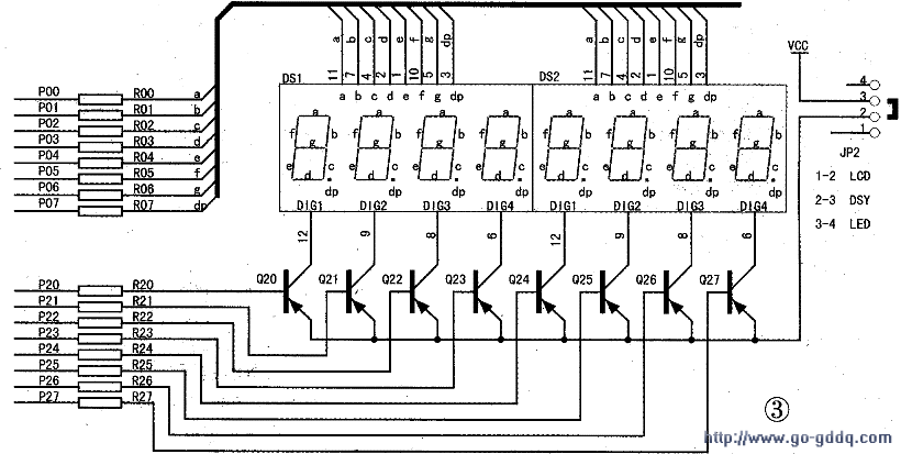 在ME300B单片机开发系统中使用数码管来显示信息时,要将JP2的2、3端短接。见图3。