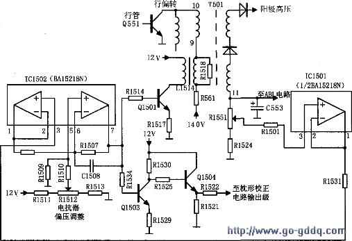 以松下(画王)TC-33V30H彩电(右图)为例介绍该高压稳压电路。由图可知:行输出管Q551集电极供电是由140v经R561、易磁饱和电抗器L1514次级、行输出变压器初级9、10绕组提供的。当图像画面为亮景时,显像管中的电子束流增大,阳极高压势必降低,反映在行输出变压器次级高压绕组末端的11脚的必降低,也就使加在运算放大器l50l(BAl5218N)3脚(输入端)的电压降低,经放大后其1脚的输出电压降低,也就使经R1531加至运算放大器Icl502(BAl5218N)3脚(同相输入端)的电压降低,经放大后1脚输出电压下降,即加在Icl502另一放大器6脚(输入端)电压降低,经放大后7脚输出电压上升,即经R1514加至Q1501 b极电压上升,Q1501导通增加,使流过电抗器L1514初级线圈的电流增大,于是L1514的量下降,次级绕组下降,导致流过次级绕组,也就是流过行输出变压器初级绕组的电流增大,以增加激励,以使高压升高,反之亦然。这样,由于高压趋于自动稳定,图像尺寸也趋于自动稳定。图中R1512是Q1501工作点调整,即L1514起控点高低的调整。另外Q1503、Q1504是用以稳定光栅尺寸的。当画面为亮景(即高压下降)时,由上述分析可知7脚输出电压是上升的,显然Q1503导通增加,c极电压下降,即Q1504 b极电压下降,Q1504导通减弱,其e极电压升高,使得经R1522送至枕形校正电路输出级管b极的升高,使输出管导通增大,导致流过行偏转线圈的电流减小,使光栅水平尺寸不至于扩大(这部分电路未画出,详细原理从略),反之亦然。