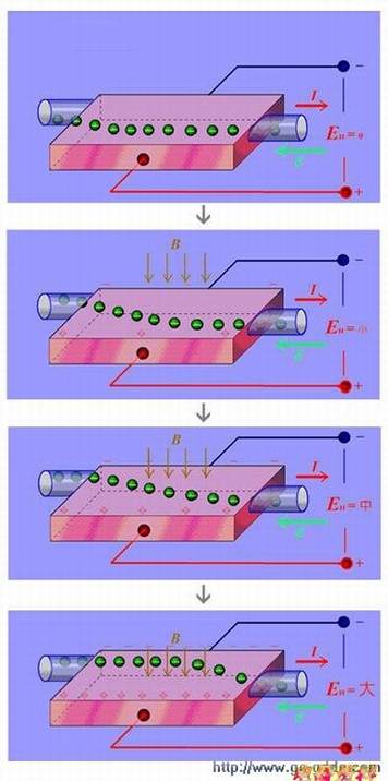 由图可以看出,流入激励电流端的电流 I 越大、作用在薄片上的磁场强度 B 越强,霍尔电势也就越高。磁场方向相反,霍尔电势的方向也随之改变,因此霍尔能用于测量静态磁场或交变磁场。