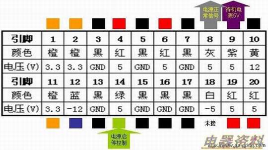 主板20针电源插口及电压: 在主板上看: 编号 输出电压 编号 输出电压 1 3.3V 11 3.3V 2 3.3V 12 -12V 3 地 13 地 4 5V 14 PS-ON 5 地 15 地 6 5V 16 地 7 地 17 地 8 PW+OK 18 -5V 9 5V-SB 19 5V 10 12V 20 5V 在电源上看: 编号 输出电压 编号 输出电压 20 5V 10 12V 19 5V 9 5V-SB 18 -5V 8 PW+OK 17 地 7 地 16 地 6 5V 15 地 5 地 14 PS-ON 4 5V 13 地 3 地 12 -12V 2 3.3V 11 3.3V 1 3.3V 可用万用电表分别测量。 另附:24 PIN ATX电源电压对照表
