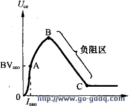 BVceo,由于基极开路无基极,晶体三极管截止,只存在极微小的穿透电流eo,如图1所示。如果不断加大集电极与发射极之间的工作电压Uce,当达到BVceo时晶体三极管即发生现象,其集电极电流Ic便急剧上升,如图1曲线中A—B段所示。当达到B点后,管压降Uce却随着电流Ic的增加而降低,如图l曲线中B-C段所示,这段区域称为负阻区,这时晶体三极管具有负阻特性。