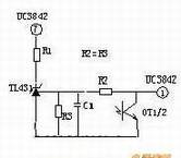 2、短路保护电路通常有两种,下图是小功率短路保护电路,其原理简述如下: 当输出电路短路,输出消失,光耦OT1不导通,UC3842①脚电压上升至5V左右,