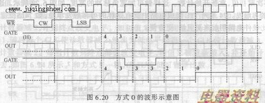 图6.20所示是方式0的波形示意图。其中丽是表示初始化时执行输出指令所发的写信号,CW表示写控制字,LSB表示写计数初值(一般情况下,写初值应有两个负脉冲,第一个送低8位,第二个送高8位。这里是为了波形简洁,只画了一个)。