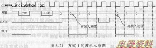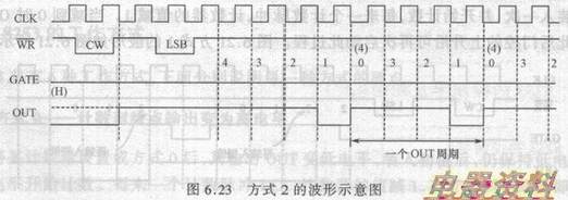经过一个CLK周期,OUT恢复高电平,且计数器又自动装入初值,重新开始计数。如此循环下去。如图6.23所示是工作在方式2的示意图。在上述过程中GATE应一直保持高电平。