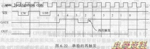 从图中可看出,门控上升沿的到来使得OUT开始输出负脉冲(这种现象叫触发),其宽度为CLK的乘以预置值。如果在负脉冲期间,即计数未到达终点,GATE再来一个上升沿,则再次赋初值,重新开始计数。这样做可加宽负脉冲的宽度,如图6.22所示。这种现象叫单稳的再触发。74系列TTL中就有这样的可再触发单稳,如74LSl23。8253的方式1比硬件电路用起来更灵活、更方便。