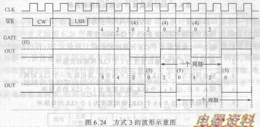 方式3类似于方式2,输出是周期性的。不同的是方式3输出方波。如果预置的初值N为偶数,则输出周期中高电平和低电平的宽度相等;如果N为奇数,则输出周期中高电平比低电平多一个CLK周期的时间,当N相当大时,也可认为是方波。当然,一般采用方式3时,置初值为偶数。