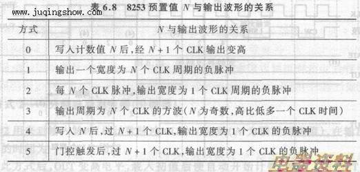 ②预置值N与输出波形的关系见表6.8。表中有几处“N+l”,这里加1是考虑到预置的初值需要一个计数脉冲才能装入。当然,对其他方式初值的装入也都需要一个CLK脉冲,只是这一个CLK在输出中不必加以考虑,因为方式1要考虑的是单稳负脉冲的宽度,而方式2,3初值的装人只影响第一个周期。