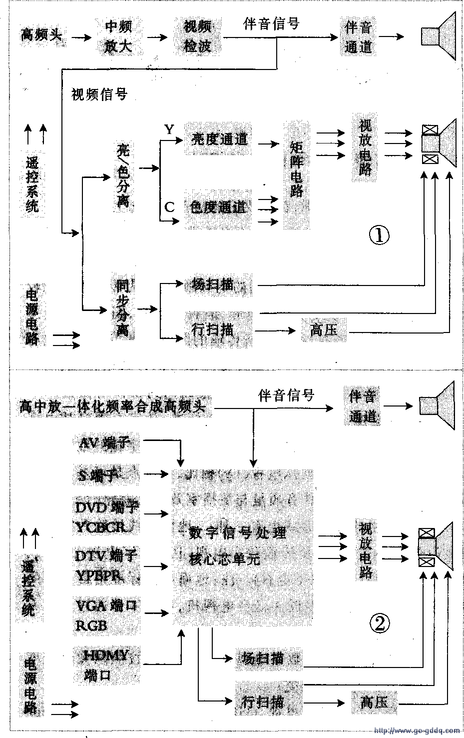 信号流程的不同主要体现在两方面:一是两者接驳信号源不同,高清电视可以接驳更多的信号源,包括模拟信号和数字信号;二是高清电视在处理图像信号时,会对信号进行数字化处理,以达到格式变换和提升画质的目的。图1、图2是两者的方框图,通过比较,可以发现上述不同。