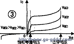 其栅极、集电极、发射极分别用G、C、E表示,IGBT管通常用于开关电路,由G极电压正、负来控制。当G极加上正电压时,绝缘栅下形成沟道,为后面的NPN型晶体管基极提供电流,从而使整个IGBT管导通。反之,当G极加负电压时IGBT管关断。IGBT管的伏安特性如图3所示。