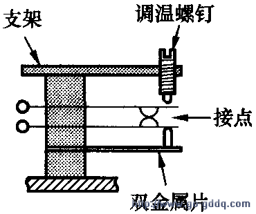 保温器的作用是将锅内温度保持在70℃左右,其结构如图所示,它由双金属片、接点和调温螺钉等构成。双金属片的形状会随温度改变,温 度越高越弯曲。保温器安装在内锅下面,当温度高于70℃时双金属片向下弯曲,接点在自身弹性作用下断开;当温度低于70℃双金属片几乎恢复平直,向上推动接点闭合使发热器加热。调节调温螺钉可使保温温度在60℃~80℃范围内改变。