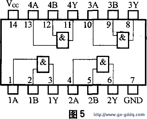 74LS08为4个2输入端与门,为14脚塑料双列直插封装,引脚功能及引线排列见图5。