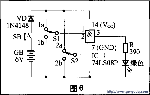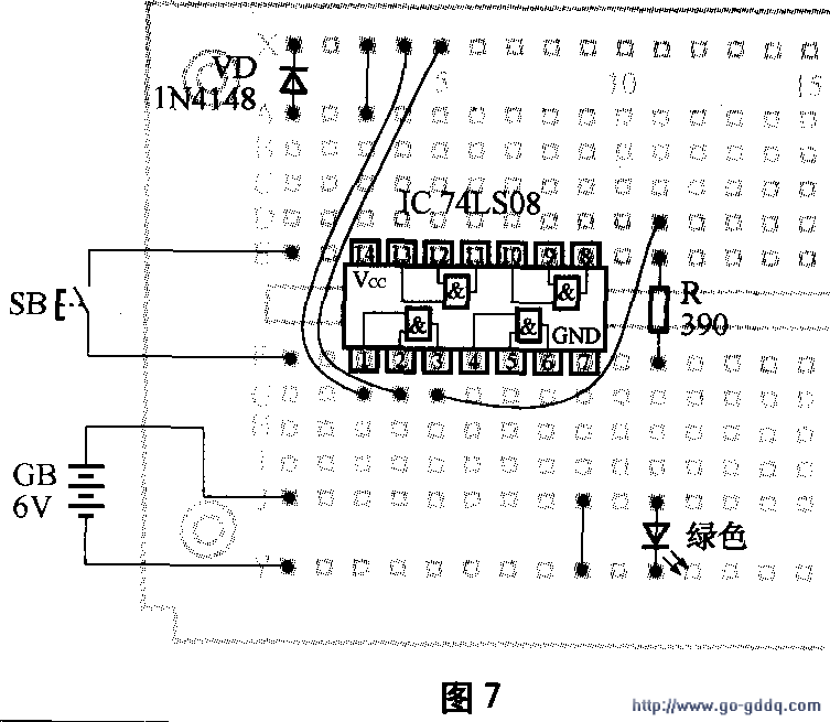 图7为74LS08P逻辑实验电路连接示意图。实验时,先连接好V及GND接线,再接其他引线;在回路中串联开关、VD,其作用是一旦GB正负极引线接反时,VD即处于截止状态,保护不受到损坏;此外,利用硅