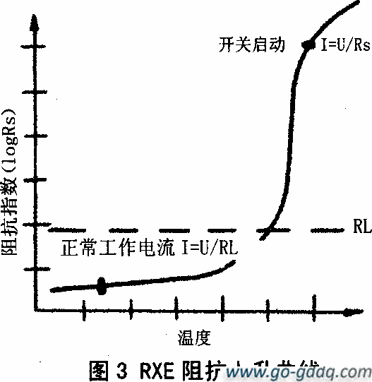 聚合开关的主要材料是由高分子及导电材料混合而成。它在动作后形成高阻状态,当故障排除后又自动返回低阻状态。在常温下,极小, 其中典型的用于保护的RXE系列产品中在30 MΩ,插入损耗小于O.1 dB。元件本身也没有任何或效应,当过流出现时,聚合开关温度升高,使材料内部的分子晶体排列结构扩张并转换成非晶体状态。高分子材料中的导电途径断开,聚合开关阻抗急剧上升,如图3曲线所示。从而把通过的量控制到最小程度,时间取决于流经的电流大小。它动作后的阻抗比未动作时增加几个数量级。只要有足够的驱动,聚合开关将保持在动作状态以保护设备。