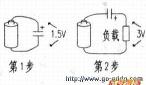 电容型开关电源的原理可以用右图的倍压过程简单地说明。升压分为2步:第1步将电容接在电池两端。电容被充电达到电池电压1.5V;第2步将充好电的电容串联在电池上。电容上的电压与电池电压叠加。达到3V的输出电压向负载供电。改变电容的数量、连接方式、充放电时间比。就可以实现升压、降压、反向等各种稳压的需要。