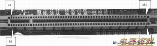 PCI-E总线按照其规格来划分可以分为7种,分别为x1、x2、x4、x8、x12、x16. x32,以满足不同系统设备对数据传输带宽的需求,最终的可用带宽将会是以250MB/s乘以通道的数量。PCI-E插槽是PCI-E总线的物理体现,较短的PCI-E卡可以插入较长的PCI-E插槽中使用。主板上常见的PCI-E 16×插槽的外观及引脚的排列如下图、下图所示。