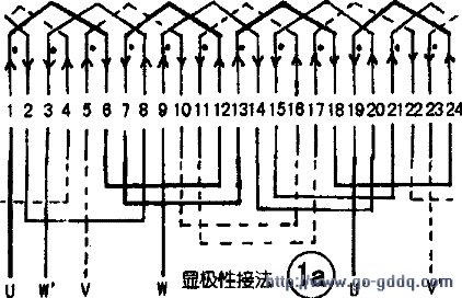 下图为24槽4极电动机绕组展开图。下图a为显极性接法。线圈节距为l-6.单层交叉式,绕组的个数等于磁极数。每相有4个单绕组。绕组的接线方式为头接头,尾接尾。图1b为隐极性接法,线圈节距为l-8,2-7.为同心式绕组。每相有2个绕组。为磁极数的1/2,接线方式采用尾接头。