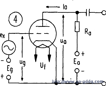 图4是一个简单的三极管放大电路。栅极回路叫输入回路,屏极回路叫输出回路。当在栅极回路接入一个微小的交流电源ex时,就会使栅压ug发生变化,如果在屏极回路中接人一个Ra,ia流过Ra时在Ra两端的压降变化要比ug的变化大得多,因此就具有电压放大作用,Ra我们叫它。