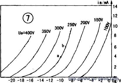 测量屏栅特性曲线仍然用图5的电路,只是把屏压ua固定在某一数值上,记录不同栅压下相应的屏流数值,就可以画出一条屏栅特性曲线。在不同的屏压下画出的多条曲线就组成屏栅特性曲线簇。