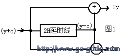 采用梳状滤波器进行色亮分离,它是根据视频信号频谱交织的原理及梳状滤波器的梳齿滤波特性,以频谱分离的方式分离出亮度和色度信号,这种梳状滤波器是由两行延迟线、加法器、减法器等部分组成(结构如图1)。我们假设相邻两行的视频信号保持相关性以及延迟线无损耗,那么输入的信号经延迟线延迟两行后,Y信号保持不变,而色副载波的则与原信号相反,所以变成Y-C,在加法器输出信号为:(Y+C)+(Y-C)=2Y;在减法器输出的信号为:(Y+C)-(Y-C)=2C,从而达到色亮分离的目的。