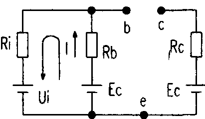 解1:(1)当最大值信号(Ui=+730mV)输入时,假设会引起放大电路的三极管进入饱和状态,则等效电路如左图所示IB=I1+I2,利用戴维南定律,IB=(Ui-Ubss)/Ri+(Ec-Ubss)/Rb。