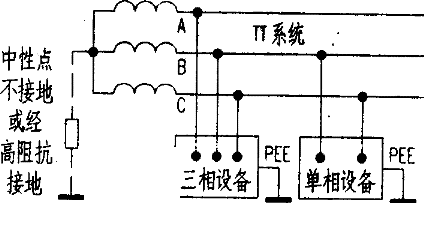 3.IT系统(下图):变压器低压侧中性点不接地或经高接地。系统中,所有用电设备的金属外壳、构架均采用保护接地方式。