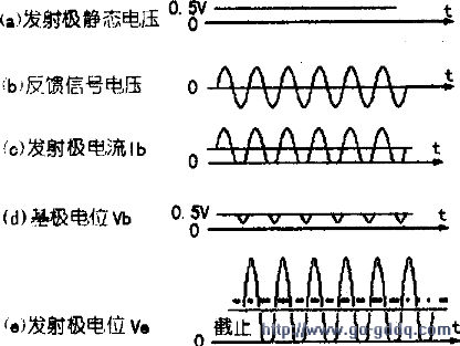 1.若晶体管的工作点设置偏低(上图a), 正反馈信号(上图b)的正半波完全通过发射结,负半波部分不能通过发射结(上图c),使基极电位(Vb)的降低(上图 d)。同时由于交流信号负半波部分截止、正半波完全导通。使集电极()有效值增加。发射极电流(Ie)有效值增加。发射极电位(Ve)升高(上图e)。所以Ube=Vb—Ve降低。