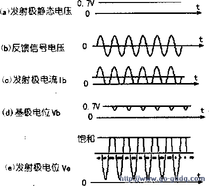2.若晶体管工作点设置偏高(中图 a),强烈的正反馈信号(中图b)的正半波完全通过发射结。负半波部分不能通过发射结(中图c),使基极电位(Vb)的有效值降低(中图d)。但交流信号正半波部分使三极管饱和、负半波导通。使集电极电流(Ic)有效值减小。发射极电流(Ie)有效值减小(Ie=Ib+Ic。且Ie》Ib),发射极电位(Ve)降低(中图e),所以U13e=Vb—Ve升高。