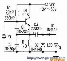 (1)采用附图的小电路测试此电路只用简单的几个元件制作而成,可用于测量在10kHz~100MHz范围内的晶振。电路中的Q1和所接阻容元件构成多频振荡器,经C3、D1、D2进行检波后,可在上得到上正下负的,驱动LED发光。若晶振已坏,LED则不亮(制作中晶振的两条引出线不能相距过近,否则振荡幅度大大减小导致发光管不亮)。