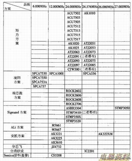 笔者整理的MP3不同方案所采用的晶振型号,见附表。U盘所用的一般都是6MHz(居多)、12MHz和24MHz,其中12MHz的最多。比如:114使用12.000MHz;CBM2090使用12.000MHz;AU9380使用12.O00MHz等等。